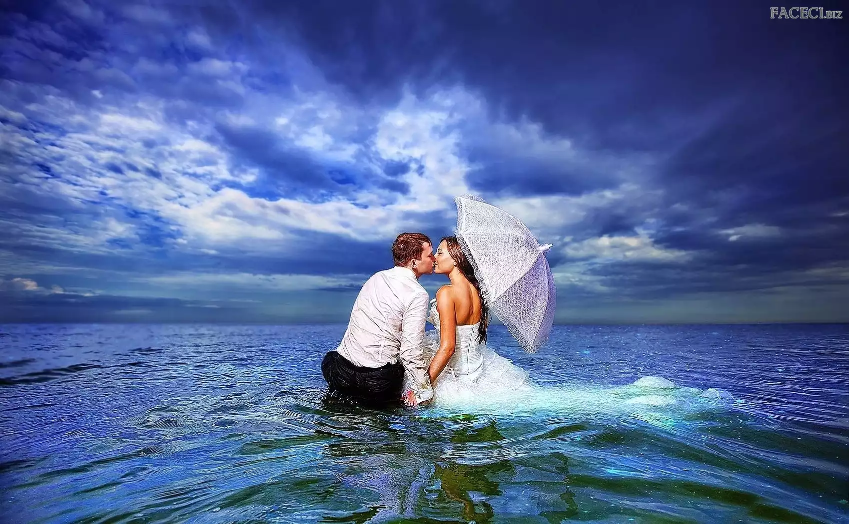 Mężczyzna, Parasol, Kobieta, Woda - faceci.biz